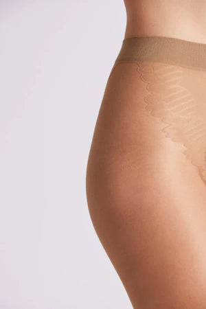 Panty de 20 DEN sin demarcación. Con braguita de encaje. Con rombo y puntera invisible. Cinturilla antipresión para un confort total.