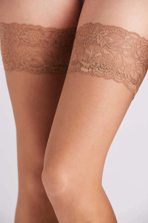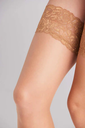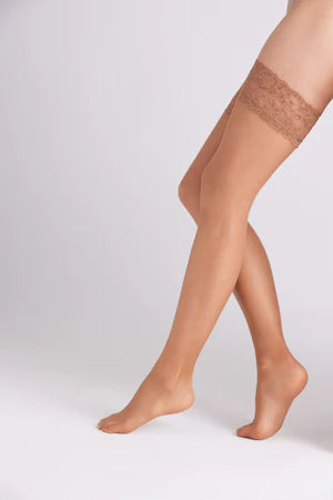 Media fría de 10 DEN con liga de blonda. Gracias a las propiedades de sus micro-partículas activas le proporcionan una permanente sensación de frescura y bienestar.