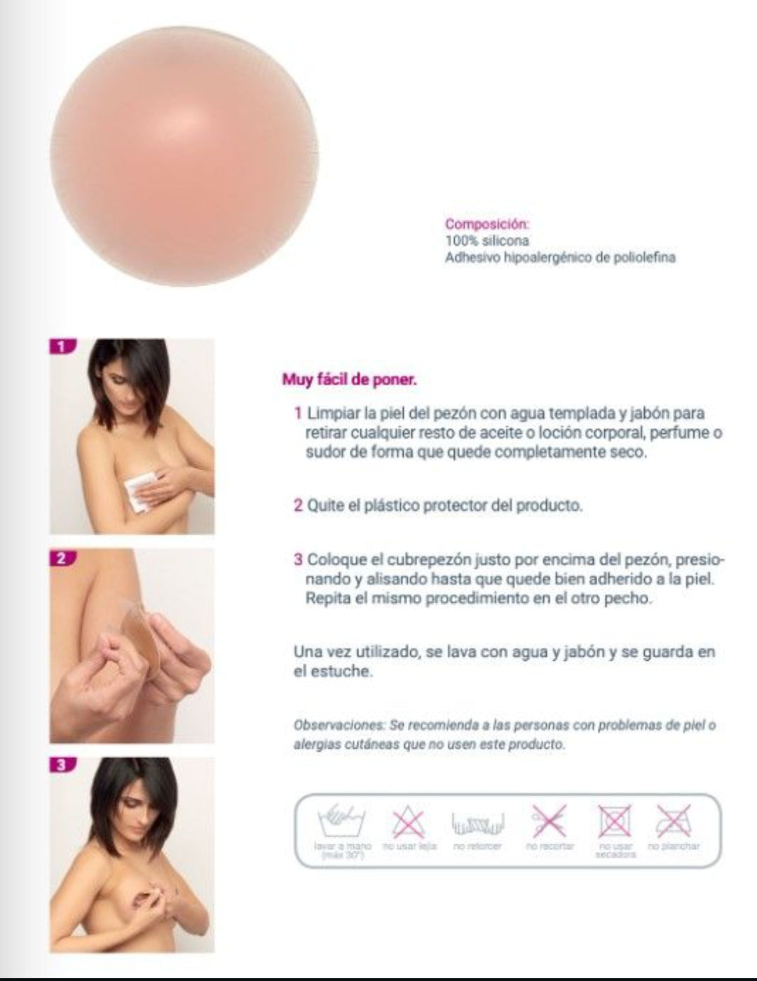 Cubre pezón de silicona adhesiva por la parte interna . El cubre pezón es transpirable gracias a la zona central que queda despejada sin silicona, para no dañar el pezón y que la piel pueda respirar para que no se despegue incluso con el calor.