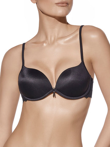 Sujetador de microfibra con aros y copa de relleno doble push up con encaje en la espalda.