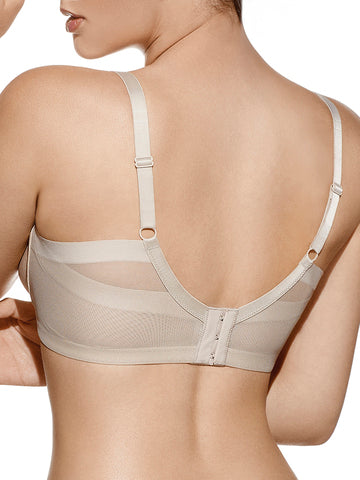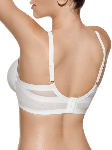 Sujetador con aros sin relleno y cruzado de tules de control con corte laser, especialmente diseñado para cubrir y minimizar las irregularidades del costado y las axilas, proporcionando una cobertura perfecta, alisando y estilizando tu figura.
