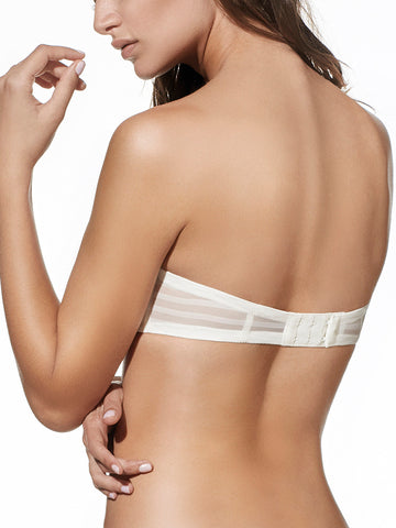 Sujetador sin tirantes. Con aros, copa de relleno y fabricado en fino tul con franjas. Incluye un juego de tirantes textiles.