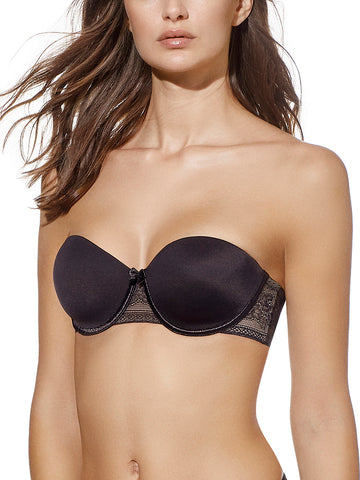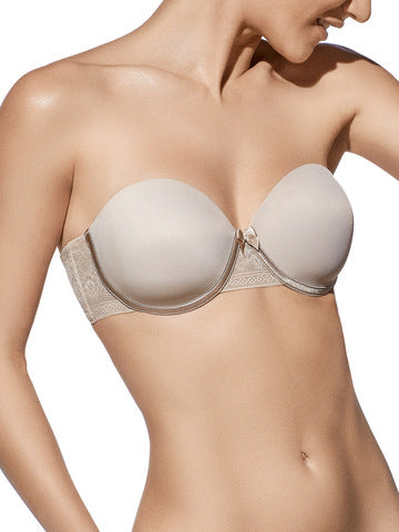 Sujetador sin tirantes, con aros, copa de relleno y fino de encaje en espalda.
